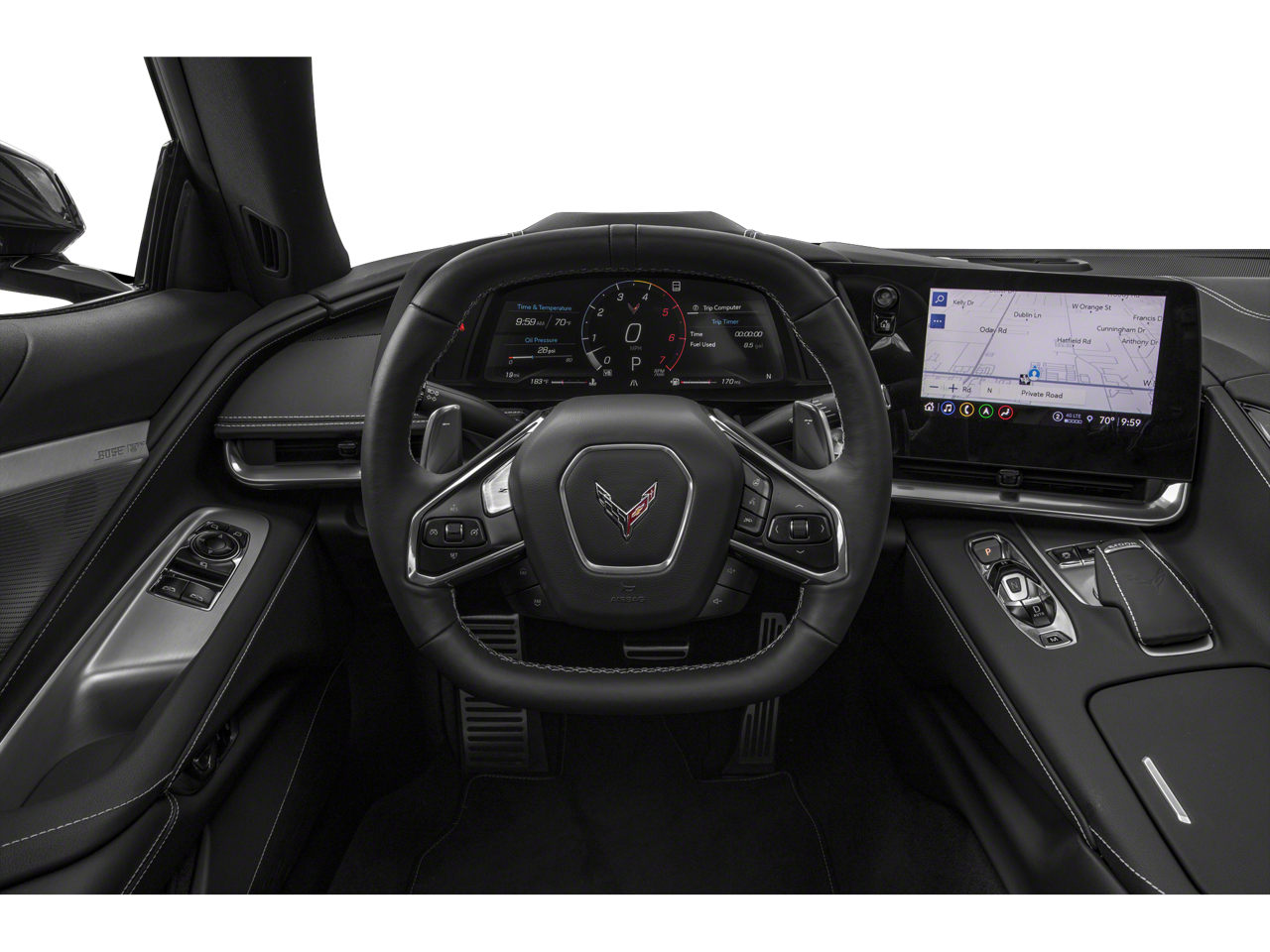 Stepping inside, the Corvette Stingray 3LT's cabin is a masterpiece of craftsmanship and technology. The Sueded Microfiber-Wrapped Steering Wheel, Two-Tone Seats, and Bose Performance Series Sound System with 14 Speakers create a truly premium and immersive driving environment.
