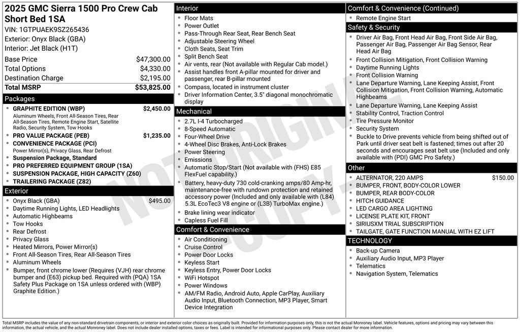 The Graphite Edition and Pro Value Package elevate this Sierra 1500 Pro to new levels of sophistication and capability. Enjoy the convenience of Remote Start, the security of a Theft-Deterrent System, and the added confidence of the Trailering Package. The 20-inch High Gloss Black painted aluminum wheels and body-color accents add a touch of refined style, while the Convenience Package and SiriusXM connectivity keep you entertained and connected on the go.